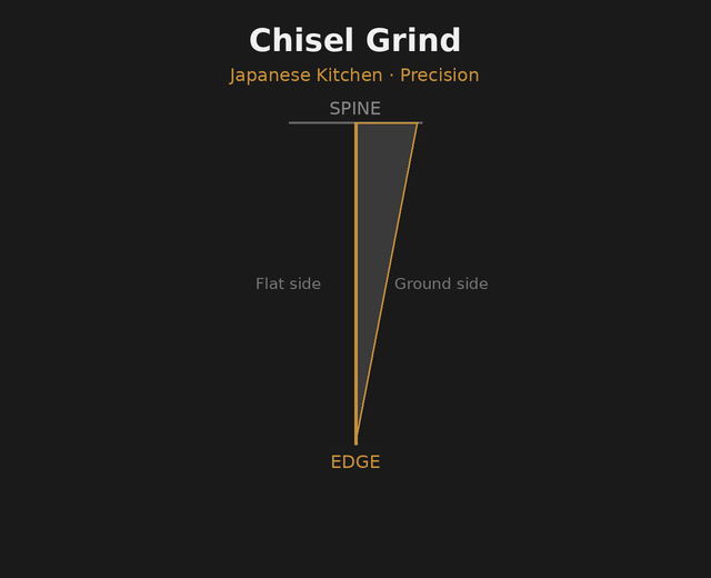 The chisel grind is ground on only one side of the blade. The other side is completely flat, like a wood chisel or a plane blade. That asymmetry produces an extremely thin, extremely sharp edge, sharper at a given angle than most symmetrical grinds can achieve.